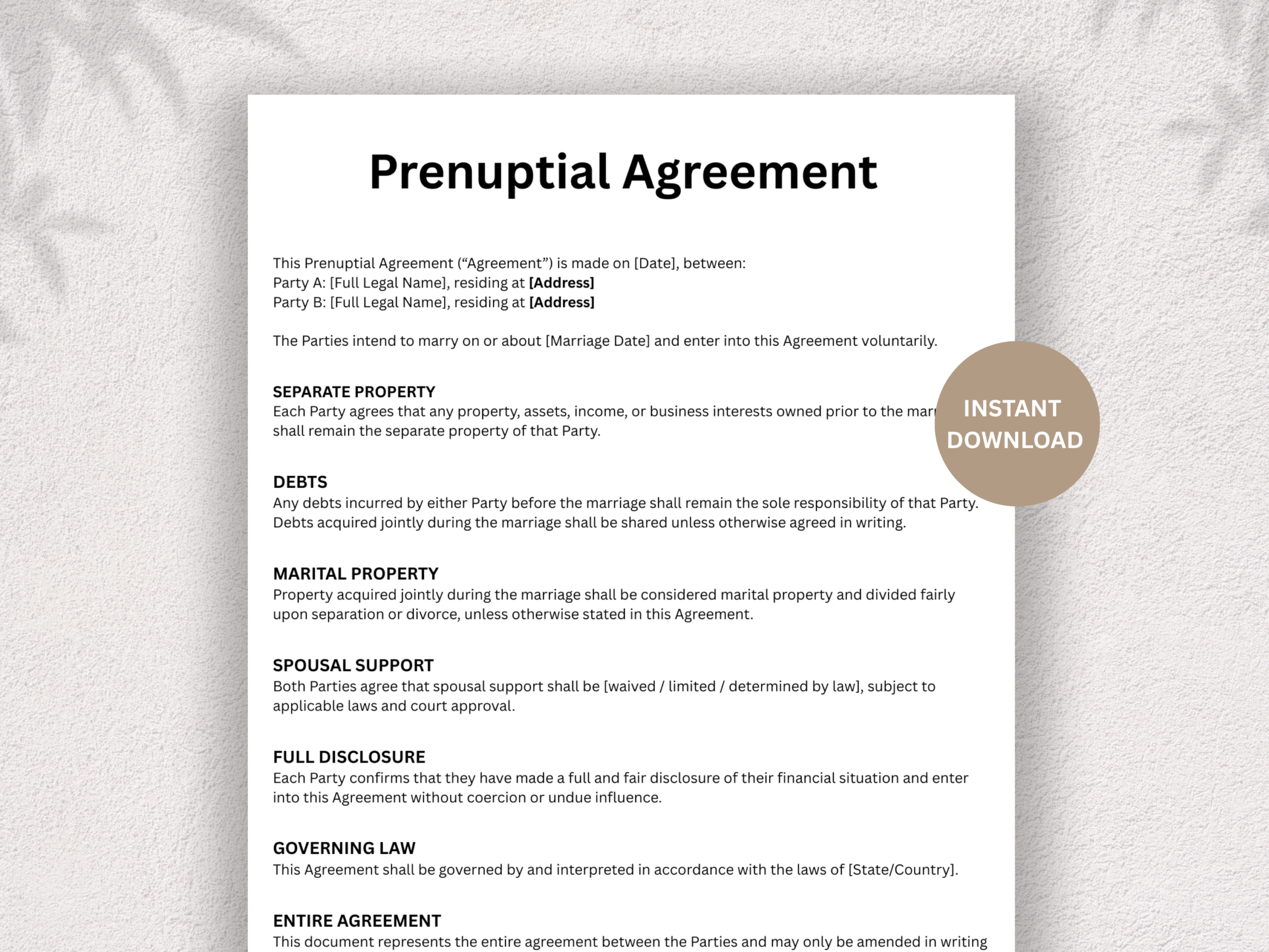 A professionally written one-page Prenuptial Agreement template designed to protect assets, define financial rights, and set clear expectations before marriage. Fully editable and ready to use.